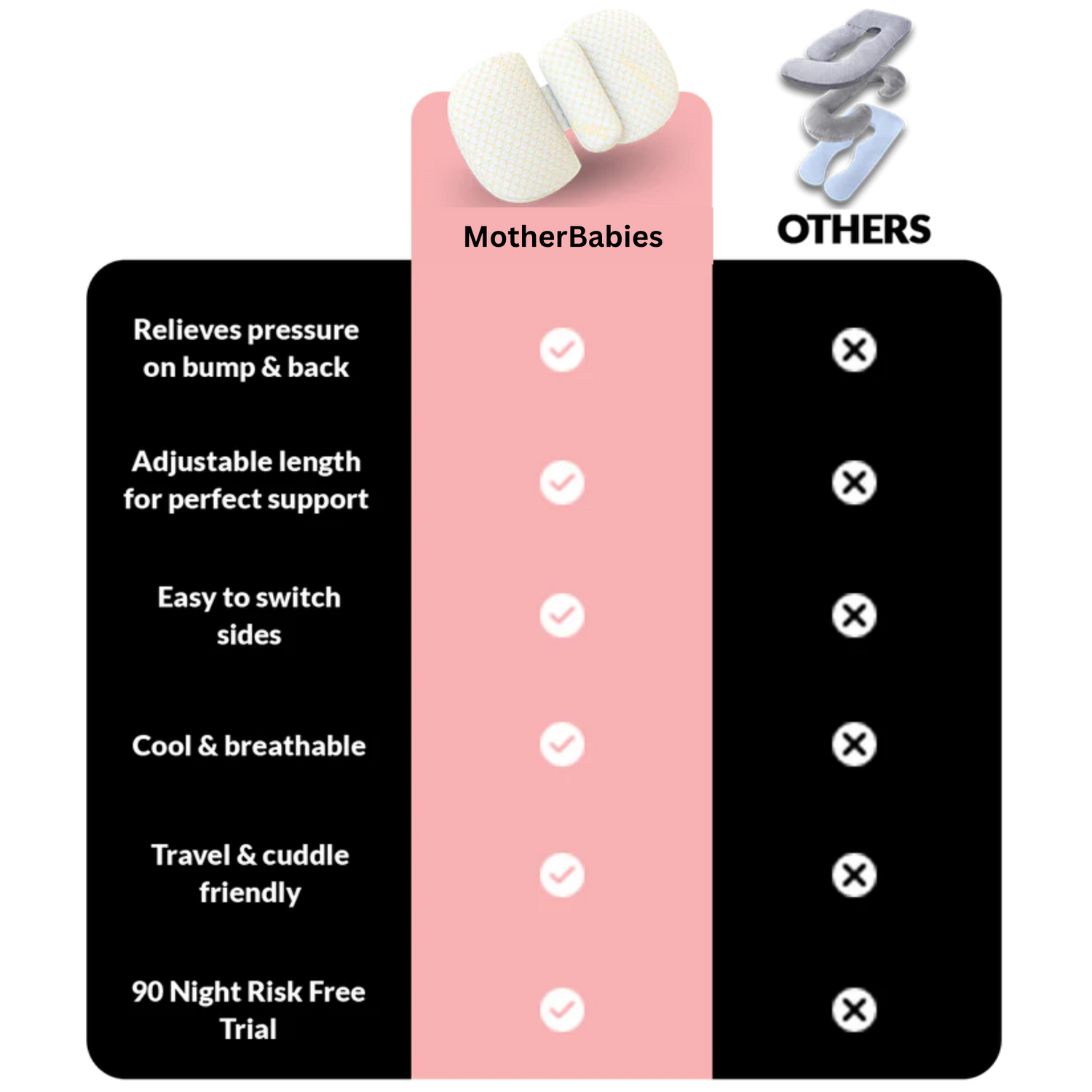 MotherBabies isn’t just about side-sleeping. It’s about side-sleeping comfortably. When you sleep more, your baby does too – until they’re 7 years old! Talk about investing in your future rest (and theirs).[9]